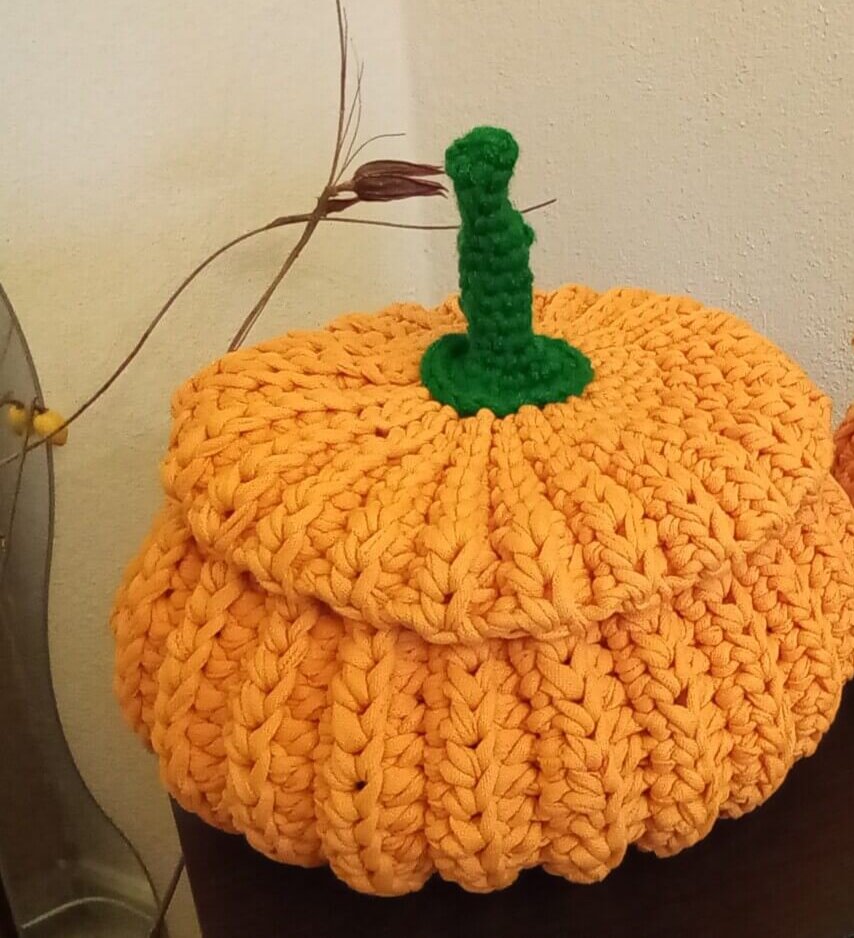 Κολοκύθα καλάθι είναι Πλεγμένο με βαμβακερό νήμα πλένεται στο πλυντήριο. Μπορείτε να το έχετε σαν καλαθάκι οι σαν διακοσμητικό μπορεί να πλεκτή και σε άλλο χρώμα.